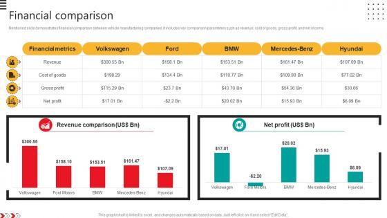 Mentioned slide demonstrates financial comparison between vehicle manufacturing companies. It includes key comparison parameters such as revenue, cost of goods, gross profit, and net income.Are you in need of a template that can accommodate all of your creative concepts This one is crafted professionally and can be altered to fit any style. Use it with Google Slides or PowerPoint. Include striking photographs, symbols, depictions, and other visuals. Fill, move around, or remove text boxes as desired. Test out color palettes and font mixtures. Edit and save your work, or work with colleagues. Download Financial Comparison Automobile Development Company Profile CP SS V and observe how to make your presentation outstanding. Give an impeccable presentation to your group and make your presentation unforgettable. Mentioned slide demonstrates financial comparison between vehicle manufacturing companies. It includes key comparison parameters such as revenue, cost of goods, gross profit, and net income.