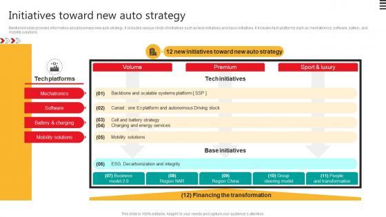Mentioned slide provides information about business new auto strategy. It includes various kinds of initiatives such as tech initiatives and basic initiatives. It includes tech platforms such as mechatronics, software, battery, and mobility solutions.This Initiatives Toward New Auto Strategy Automobile Development Company Profile CP SS V is perfect for any presentation, be it in front of clients or colleagues. It is a versatile and stylish solution for organizing your meetings. The Initiatives Toward New Auto Strategy Automobile Development Company Profile CP SS V features a modern design for your presentation meetings. The adjustable and customizable slides provide unlimited possibilities for acing up your presentation. Slidegeeks has done all the homework before launching the product for you. So, do not wait, grab the presentation templates today Mentioned slide provides information about business new auto strategy. It includes various kinds of initiatives such as tech initiatives and basic initiatives. It includes tech platforms such as mechatronics, software, battery, and mobility solutions.