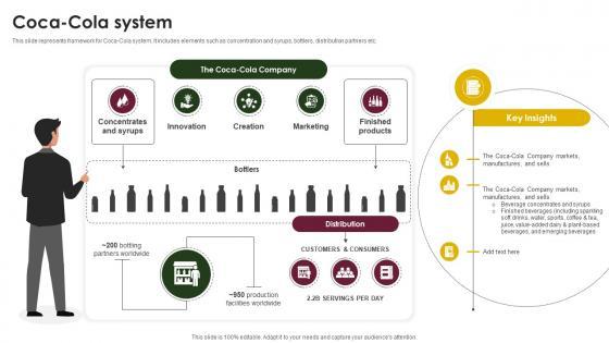 This slide represents framework for Coca-Cola system. It includes elements such as concentration and syrups, bottlers, distribution partners etc. If your project calls for a presentation, then Slidegeeks is your go-to partner because we have professionally designed, easy-to-edit templates that are perfect for any presentation. After downloading, you can easily edit Coca Cola System Beverage Manufacturer Company Profile Ppt Template CP SS V and make the changes accordingly. You can rearrange slides or fill them with different images. Check out all the handy templates This slide represents framework for Coca-Cola system. It includes elements such as concentration and syrups, bottlers, distribution partners etc.