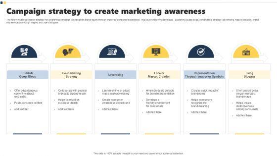 The following slide presents strategy for awareness campaign to strengthen brand equity through improved consumer experience. This covers following key steps publishing guest blogs, comarketing strategy, advertising, mascot creation, brand representation through images and use of slogans Presenting Campaign Strategy To Create Marketing Awareness Brochure PDF to dispense important information. This template comprises six stages. It also presents valuable insights into the topics including Publish Guest Blogs, Advertising, Marketing Strategy . This is a completely customizable PowerPoint theme that can be put to use immediately. So, download it and address the topic impactfully.