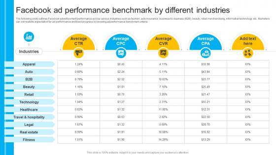 The following slide outlines Facebook advertisement performance across various industries such as fashion, auto insurance, business-to-business B2B, beauty, retail merchandising, information technology, etc. Marketers can set realistic expectation for ad performance and track progress by knowing ad performance benchmark criteria. Find highly impressive How To Create Cost Effective Facebook Ad Performance Benchmark By Strategy SS V on Slidegeeks to deliver a meaningful presentation. You can save an ample amount of time using these presentation templates. No need to worry to prepare everything from scratch because Slidegeeks experts have already done a huge research and work for you. You need to download How To Create Cost Effective Facebook Ad Performance Benchmark By Strategy SS V for your upcoming presentation. All the presentation templates are 100 percent editable and you can change the color and personalize the content accordingly. Download now The following slide outlines Facebook advertisement performance across various industries such as fashion, auto insurance, business-to-business B2B, beauty, retail merchandising, information technology, etc. Marketers can set realistic expectation for ad performance and track progress by knowing ad performance benchmark criteria.