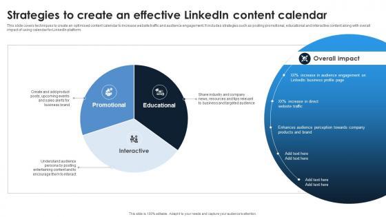 This slide covers techniques to create an optimised content calendar to increase website traffic and audience engagement. It includes strategies such as posting promotional, educational and interactive content along with overall impact of using calendar for LinkedIn platform. Do you have to make sure that everyone on your team knows about any specific topic I yes, then you should give Linkedin Content Strategies Strategies To Create An Effective Linkedin Content MKT SS V a try. Our experts have put a lot of knowledge and effort into creating this impeccable Linkedin Content Strategies Strategies To Create An Effective Linkedin Content MKT SS V. You can use this template for your upcoming presentations, as the slides are perfect to represent even the tiniest detail. You can download these templates from the Slidegeeks website and these are easy to edit. So grab these today This slide covers techniques to create an optimised content calendar to increase website traffic and audience engagement. It includes strategies such as posting promotional, educational and interactive content along with overall impact of using calendar for LinkedIn platform.