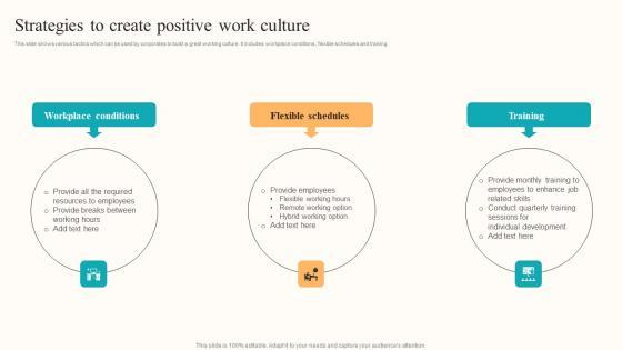 This slide shows various tactics which can be used by corporates to build a great working culture. It includes workplace conditions, flexible schedules and training. Slidegeeks has constructed Strategies Create Positive Developing Employee Centric Marketing Program Pictures Pdf after conducting extensive research and examination. These presentation templates are constantly being generated and modified based on user preferences and critiques from editors. Here, you will find the most attractive templates for a range of purposes while taking into account ratings and remarks from users regarding the content. This is an excellent jumping off point to explore our content and will give new users an insight into our top notch PowerPoint Templates. This slide shows various tactics which can be used by corporates to build a great working culture. It includes workplace conditions, flexible schedules and training.