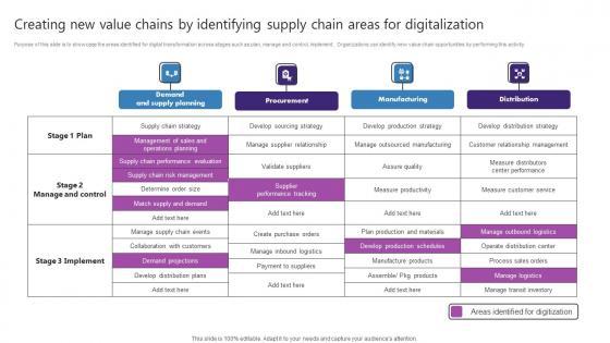 Purpose of this slide is to showcase the areas identified for digital transformation across stages such as plan, manage and control, implement. Organizations can identify new value chain opportunities by performing this activity. If your project calls for a presentation, then Slidegeeks is your go-to partner because we have professionally designed, easy-to-edit templates that are perfect for any presentation. After downloading, you can easily edit Creating New Value Chains By Identifying Supply Chain Areas For Digitalization Download PDF and make the changes accordingly. You can rearrange slides or fill them with different images. Check out all the handy templates