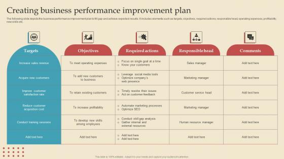 The following slide depicts the business performance improvement plan to fill gap and achieve expected results. It includes elements such as targets, objectives, required actions, responsible head, operating expenses, profitability, new skills etc. Are you searching for a Creating Business Describing Business Performance Administration Goals Demonstration Pdf that is uncluttered, straightforward, and original Its easy to edit, and you can change the colors to suit your personal or business branding. For a presentation that expresses how much effort you have put in, this template is ideal With all of its features, including tables, diagrams, statistics, and lists, its perfect for a business plan presentation. Make your ideas more appealing with these professional slides. Download Creating Business Describing Business Performance Administration Goals Demonstration Pdf from Slidegeeks today. The following slide depicts the business performance improvement plan to fill gap and achieve expected results. It includes elements such as targets, objectives, required actions, responsible head, operating expenses, profitability, new skills etc.