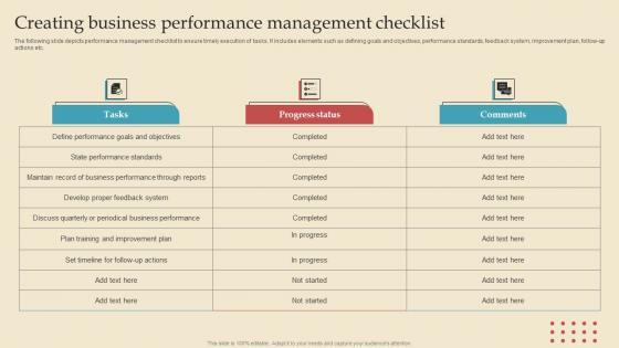 The following slide depicts performance management checklist to ensure timely execution of tasks. It includes elements such as defining goals and objectives, performance standards, feedback system, improvement plan, follow up actions etc. Retrieve professionally designed Creating Business Performance Describing Business Performance Administration Goals Infographics Pdf to effectively convey your message and captivate your listeners. Save time by selecting pre made slideshows that are appropriate for various topics, from business to educational purposes. These themes come in many different styles, from creative to corporate, and all of them are easily adjustable and can be edited quickly. Access them as PowerPoint templates or as Google Slides themes. You do not have to go on a hunt for the perfect presentation because Slidegeeks got you covered from everywhere. The following slide depicts performance management checklist to ensure timely execution of tasks. It includes elements such as defining goals and objectives, performance standards, feedback system, improvement plan, follow up actions etc.