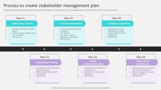 Following slide exhibits process to develop stakeholder management plan. It includes steps such as stakeholder analysis, meeting, prioritize, create communication plan etc. This Project Stakeholders Management Process To Create Stakeholder Management Ppt Powerpoint from Slidegeeks makes it easy to present information on your topic with precision. It provides customization options, so you can make changes to the colors, design, graphics, or any other component to create a unique layout. It is also available for immediate download, so you can begin using it right away. Slidegeeks has done good research to ensure that you have everything you need to make your presentation stand out. Make a name out there for a brilliant performance. Following slide exhibits process to develop stakeholder management plan. It includes steps such as stakeholder analysis, meeting, prioritize, create communication plan etc.