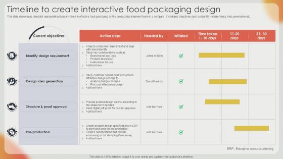 This slide showcases checklist representing tasks involved in effective food packaging by the product development team in a company. It contains objectives such as identify requirements, idea generation etc. Find highly impressive Timeline To Create Interactive Effective Strategies For Strengthening Food Ppt Sample on Slidegeeks to deliver a meaningful presentation. You can save an ample amount of time using these presentation templates. No need to worry to prepare everything from scratch because Slidegeeks experts have already done a huge research and work for you. You need to download Timeline To Create Interactive Effective Strategies For Strengthening Food Ppt Sample for your upcoming presentation. All the presentation templates are 100 percent editable and you can change the color and personalize the content accordingly. Download now This slide showcases checklist representing tasks involved in effective food packaging by the product development team in a company. It contains objectives such as identify requirements, idea generation etc.