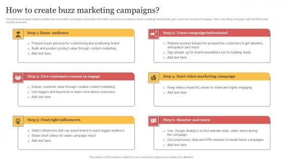 This slide showcases steps to initiate buzz promotion campaigns. It provides information about know audience, tease campaign beforehand, give customers reasons to engage, video marketing campaign, optimal influencers, monitor and learn. There are so many reasons you need a Buzz Marketing Strategies To Expand Campaign Reach How To Create Buzz Marketing Campaigns Structure PDF. The first reason is you can not spend time making everything from scratch, Thus, Slidegeeks has made presentation templates for you too. You can easily download these templates from our website easily.