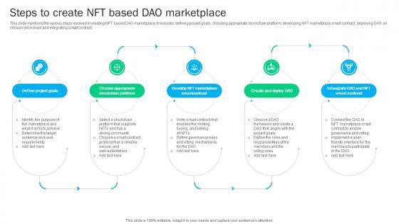 This slide mentions the various steps involved in creating NFT based DAO marketplace. It includes defining project goals, choosing appropriate blockchain platform, developing NFT marketplace smart contract, deploying DAO on chosen blockchain and integrating smart contract. Do you have to make sure that everyone on your team knows about any specific topic I yes, then you should give Guide To Understanding Decentralized Steps To Create NFT Based DAO Marketplace BCT SS V a try. Our experts have put a lot of knowledge and effort into creating this impeccable Guide To Understanding Decentralized Steps To Create NFT Based DAO Marketplace BCT SS V. You can use this template for your upcoming presentations, as the slides are perfect to represent even the tiniest detail. You can download these templates from the Slidegeeks website and these are easy to edit. So grab these today This slide mentions the various steps involved in creating NFT based DAO marketplace. It includes defining project goals, choosing appropriate blockchain platform, developing NFT marketplace smart contract, deploying DAO on chosen blockchain and integrating smart contract.