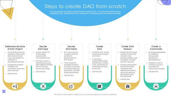 This slide mentions the steps to be followed when creating a DOA. It includes determining structure, deciding DAO type, deciding DAO token, creating DOA, managing treasury and creating community. There are so many reasons you need a Guide To Understanding Decentralized Steps To Create DAO From Scratch BCT SS V. The first reason is you can not spend time making everything from scratch, Thus, Slidegeeks has made presentation templates for you too. You can easily download these templates from our website easily. This slide mentions the steps to be followed when creating a DOA. It includes determining structure, deciding DAO type, deciding DAO token, creating DOA, managing treasury and creating community.