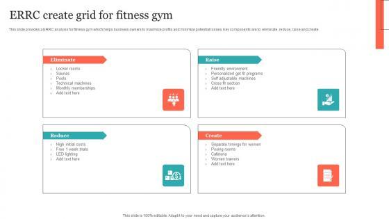 This slide provides a ERRC analysis for fitness gym which helps business owners to maximize profits and minimize potential losses. Key components are to eliminate, reduce, raise and create. Pitch your topic with ease and precision using this ERRC Create Grid For Fitness Gym Mockup Pdf. This layout presents information on Eliminate, Reduce, Create. It is also available for immediate download and adjustment. So, changes can be made in the color, design, graphics or any other component to create a unique layout. This slide provides a ERRC analysis for fitness gym which helps business owners to maximize profits and minimize potential losses. Key components are to eliminate, reduce, raise and create.