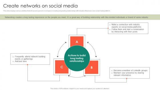 This slide displays various activities that will assist a person or company in creating long lasting relationships with industry influencers over social media platform.Find a pre-designed and impeccable Comprehensive Personal Branding Guidelines Create Networks On Social Media Themes PDF. The templates can ace your presentation without additional effort. You can download these easy-to-edit presentation templates to make your presentation stand out from others. So, what are you waiting for Download the template from Slidegeeks today and give a unique touch to your presentation.