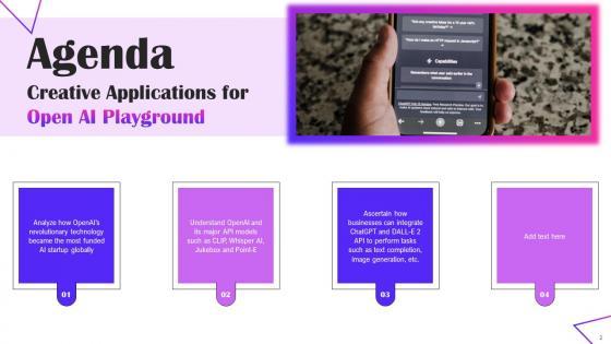Find a pre-designed and impeccable Agenda Creative Applications For Open AI Playground Download Pdf. The templates can ace your presentation without additional effort. You can download these easy-to-edit presentation templates to make your presentation stand out from others. So, what are you waiting for Download the template from Slidegeeks today and give a unique touch to your presentation. Our Agenda Creative Applications For Open AI Playground Download Pdf are topically designed to provide an attractive backdrop to any subject. Use them to look like a presentation pro.