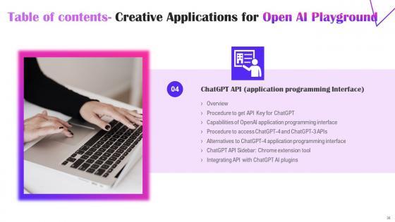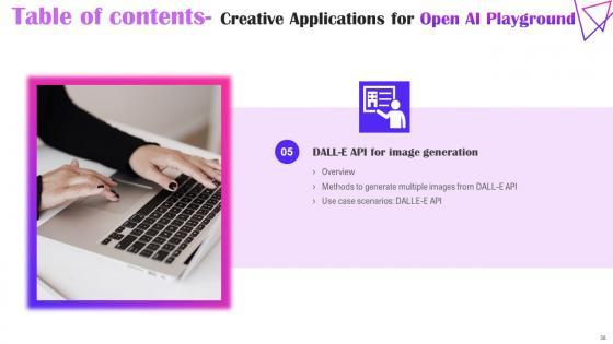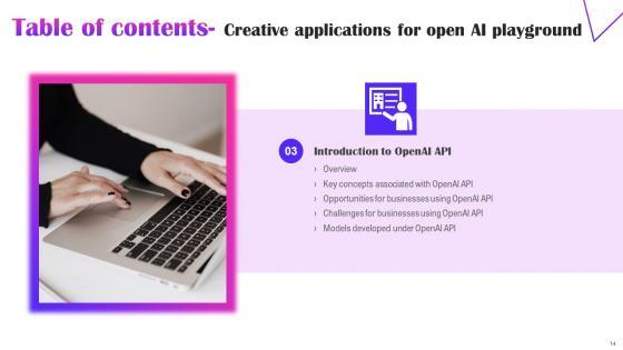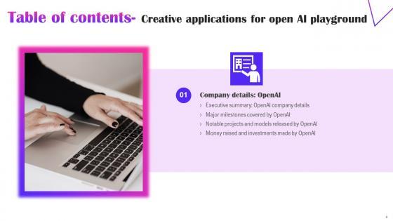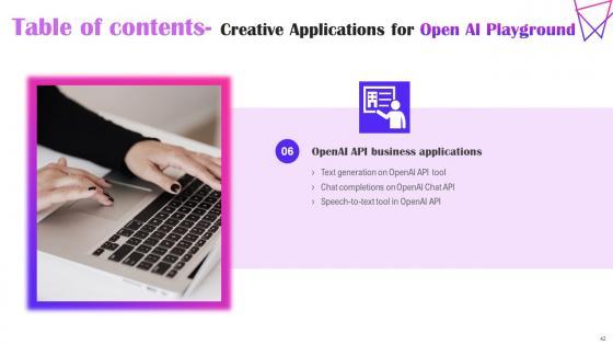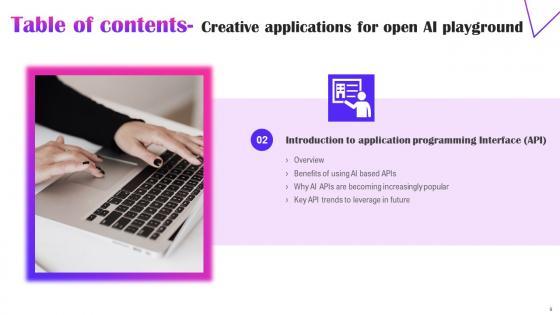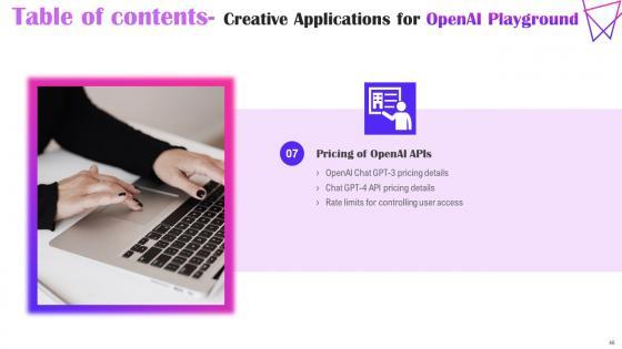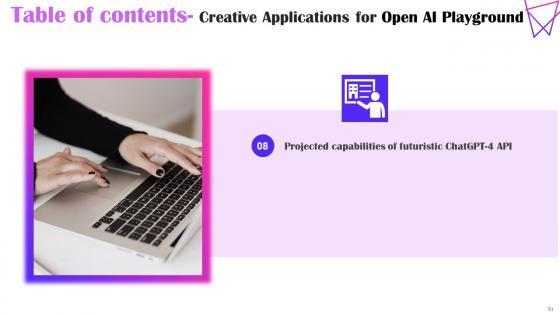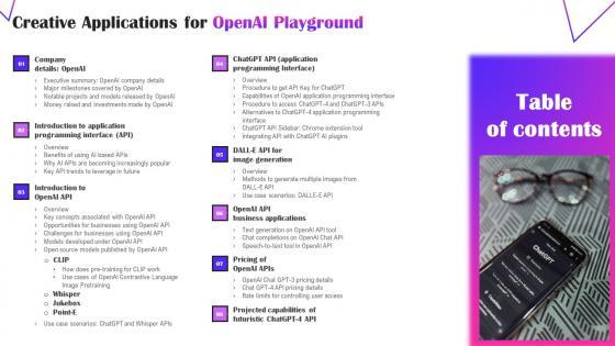Find a pre-designed and impeccable Table Of Contents Creative Applications For OpenAI Playground Designs Pdf. The templates can ace your presentation without additional effort. You can download these easy-to-edit presentation templates to make your presentation stand out from others. So, what are you waiting for Download the template from Slidegeeks today and give a unique touch to your presentation. Our Table Of Contents Creative Applications For OpenAI Playground Designs Pdf are topically designed to provide an attractive backdrop to any subject. Use them to look like a presentation pro.