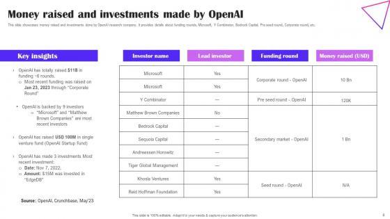 This slide showcases money raised and investments done by OpenAI research company. It provides details about funding rounds, Microsoft, Y Combinator, Bedrock Capital, Pre seed round, Corporate round, etc. This modern and well-arranged Money Raised And Investments Made By OpenAI Creative Applications For Open AI Ideas Pdf provides lots of creative possibilities. It is very simple to customize and edit with the Powerpoint Software. Just drag and drop your pictures into the shapes. All facets of this template can be edited with Powerpoint no extra software is necessary. Add your own material, put your images in the places assigned for them, adjust the colors, and then you can show your slides to the world, with an animated slide included. This slide showcases money raised and investments done by OpenAI research company. It provides details about funding rounds, Microsoft, Y Combinator, Bedrock Capital, Pre seed round, Corporate round, etc.