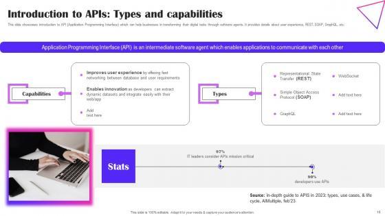 This slide showcases introduction to API Application Programming Interface which can help businesses in transforming their digital tasks through software agents. It provides details about user experience, REST, SOAP, GraphQL, etc. If you are looking for a format to display your unique thoughts, then the professionally designed Introduction To APIs Types And Capabilities Creative Applications For Open AI Microsoft Pdf is the one for you. You can use it as a Google Slides template or a PowerPoint template. Incorporate impressive visuals, symbols, images, and other charts. Modify or reorganize the text boxes as you desire. Experiment with shade schemes and font pairings. Alter, share or cooperate with other people on your work. Download Introduction To APIs Types And Capabilities Creative Applications For Open AI Microsoft Pdf and find out how to give a successful presentation. Present a perfect display to your team and make your presentation unforgettable. This slide showcases introduction to API Application Programming Interface which can help businesses in transforming their digital tasks through software agents. It provides details about user experience, REST, SOAP, GraphQL, etc.