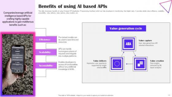 This slide showcases benefits of using AI based API Application Programming Interface which can help developers in transforming their digital tasks. It provides details about efficiency, scalability, accessibility, value delivery, value capture, value creation, etc. Create an editable Benefits Of Using AI Based APIs Creative Applications For Open AI Clipart Pdf that communicates your idea and engages your audience. Whether you are presenting a business or an educational presentation, pre-designed presentation templates help save time. Benefits Of Using AI Based APIs Creative Applications For Open AI Clipart Pdf is highly customizable and very easy to edit, covering many different styles from creative to business presentations. Slidegeeks has creative team members who have crafted amazing templates. So, go and get them without any delay. This slide showcases benefits of using AI based API Application Programming Interface which can help developers in transforming their digital tasks. It provides details about efficiency, scalability, accessibility, value delivery, value capture, value creation, etc.