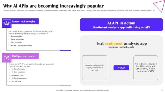 This slide showcases key reasons why AI based APIsApplication Programming Interface are becoming highly popular in the market. It provides details about newer technologies such as computer vision, facial recognition, sentiment analysis, etc. There are so many reasons you need a Why AI APIs Are Becoming Increasingly Popular Creative Applications For Open AI Topics Pdf. The first reason is you can not spend time making everything from scratch, Thus, Slidegeeks has made presentation templates for you too. You can easily download these templates from our website easily. This slide showcases key reasons why AI based APIsApplication Programming Interface are becoming highly popular in the market. It provides details about newer technologies such as computer vision, facial recognition, sentiment analysis, etc.