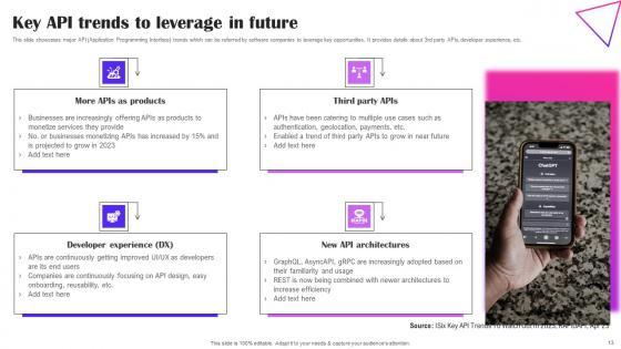 This slide showcases major API Application Programming Interface trends which can be referred by software companies to leverage key opportunities. It provides details about 3rd party APIs, developer experience, etc. Are you in need of a template that can accommodate all of your creative concepts This one is crafted professionally and can be altered to fit any style. Use it with Google Slides or PowerPoint. Include striking photographs, symbols, depictions, and other visuals. Fill, move around, or remove text boxes as desired. Test out color palettes and font mixtures. Edit and save your work, or work with colleagues. Download Key API Trends To Leverage In Future Creative Applications For Open AI Topics Pdf and observe how to make your presentation outstanding. Give an impeccable presentation to your group and make your presentation unforgettable. This slide showcases major API Application Programming Interface trends which can be referred by software companies to leverage key opportunities. It provides details about 3rd party APIs, developer experience, etc.