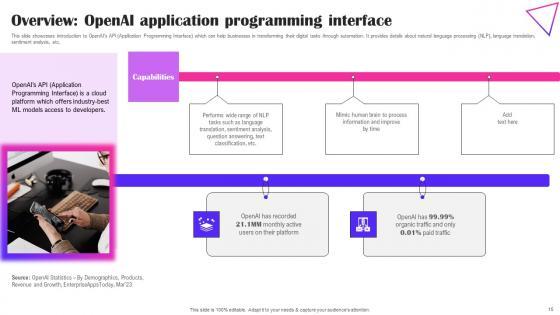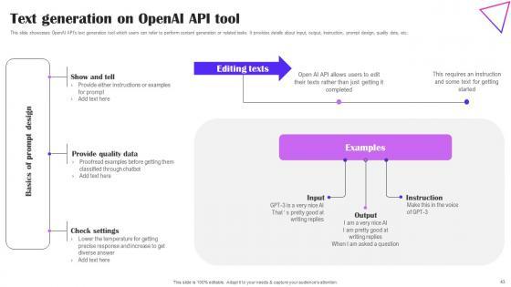 Use this Creative Applications For OpenAI Playground Ppt Powerpoint Presentation Complete Deck to ensure the business world gets to know you as a presentation expert with tremendous recall value. With its focus on providing the worlds best designs to highlight business ideas that have the potential to change the world, this PPT Template is sure to win you clients. The complete deck in sixty slides is a compendium of information, structured in a manner that provides the best framework for a presentation. Use this completely editable and customizable presentation to make an impact and improve your order book. Download now. Our Creative Applications For OpenAI Playground Ppt Powerpoint Presentation Complete Deck are topically designed to provide an attractive backdrop to any subject. Use them to look like a presentation pro.