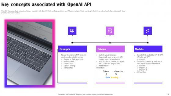 This slide showcases basic concepts which are associated with OpenAI, which can help developers and IT heads prioritize AI tools according to their infrastructure needs. It provides details about prompts, tokens and models. Crafting an eye-catching presentation has never been more straightforward. Let your presentation shine with this tasteful yet straightforward Key Concepts Associated With OpenAI API Creative Applications For Open AI Diagrams Pdf template. It offers a minimalistic and classy look that is great for making a statement. The colors have been employed intelligently to add a bit of playfulness while still remaining professional. Construct the ideal Key Concepts Associated With OpenAI API Creative Applications For Open AI Diagrams Pdf that effortlessly grabs the attention of your audience. Begin now and be certain to wow your customers. This slide showcases basic concepts which are associated with OpenAI, which can help developers and IT heads prioritize AI tools according to their infrastructure needs. It provides details about prompts, tokens and models.
