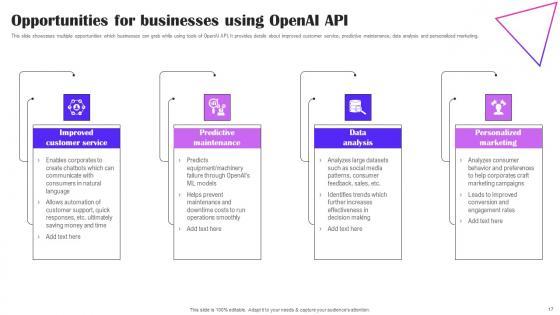 This slide showcases multiple opportunities which businesses can grab while using tools of OpenAI API. It provides details about improved customer service, predictive maintenance, data analysis and personalized marketing. Are you searching for a Opportunities For Businesses Using OpenAI API Creative Applications For Open AI Infographics Pdf that is uncluttered, straightforward, and original It is easy to edit, and you can change the colors to suit your personal or business branding. For a presentation that expresses how much effort you have put in, this template is ideal With all of its features, including tables, diagrams, statistics, and lists, it is perfect for a business plan presentation. Make your ideas more appealing with these professional slides. Download Opportunities For Businesses Using OpenAI API Creative Applications For Open AI Infographics Pdf from Slidegeeks today. This slide showcases multiple opportunities which businesses can grab while using tools of OpenAI API. It provides details about improved customer service, predictive maintenance, data analysis and personalized marketing.