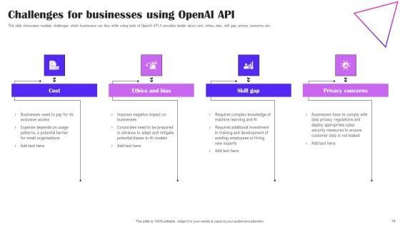 This slide showcases multiple challenges which businesses can face while using tools of OpenAI API. It provides details about cost, ethics, bias, skill gap, privacy concerns, etc. Want to ace your presentation in front of a live audience Our Challenges For Businesses Using OpenAI API Creative Applications For Open AI Slides Pdf can help you do that by engaging all the users towards you. Slidegeeks experts have put their efforts and expertise into creating these impeccable powerpoint presentations so that you can communicate your ideas clearly. Moreover, all the templates are customizable, and easy-to-edit and downloadable. Use these for both personal and commercial use. This slide showcases multiple challenges which businesses can face while using tools of OpenAI API. It provides details about cost, ethics, bias, skill gap, privacy concerns, etc.