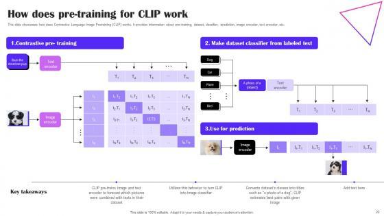 This slide showcases how does Contrastive Language Image Pretraining CLIP works. It provides information about pre-training, dataset, classifier, prediction, image encoder, text encoder, etc. Do you have an important presentation coming up Are you looking for something that will make your presentation stand out from the rest Look no further than How Does Pre Training For Clip Work Creative Applications For Open AI Designs Pdf. With our professional designs, you can trust that your presentation will pop and make delivering it a smooth process. And with Slidegeeks, you can trust that your presentation will be unique and memorable. So why wait Grab How Does Pre Training For Clip Work Creative Applications For Open AI Designs Pdf today and make your presentation stand out from the rest. This slide showcases how does Contrastive Language Image Pretraining CLIP works. It provides information about pre-training, dataset, classifier, prediction, image encoder, text encoder, etc.