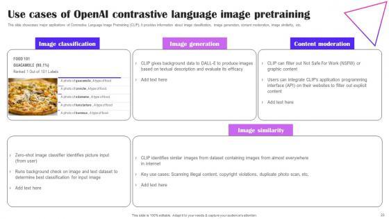 This slide showcases major applications of Contrastive Language Image Pretraining CLIP. It provides information about image classification, image generation, content moderation, image similarity, etc. Want to ace your presentation in front of a live audience Our Use Cases Of OpenAI Contrastive Language Image Creative Applications For Open AI Diagrams Pdf can help you do that by engaging all the users towards you. Slidegeeks experts have put their efforts and expertise into creating these impeccable powerpoint presentations so that you can communicate your ideas clearly. Moreover, all the templates are customizable, and easy-to-edit and downloadable. Use these for both personal and commercial use. This slide showcases major applications of Contrastive Language Image Pretraining CLIP. It provides information about image classification, image generation, content moderation, image similarity, etc.