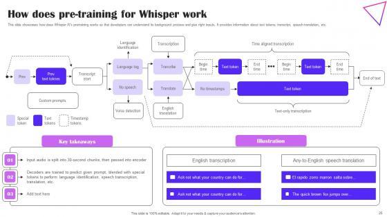 This slide showcases how does Whisper AIs pretraining works so that developers can understand its background process and give right inputs. It provides information about text tokens, transcript, speech translation, etc. Whether you have daily or monthly meetings, a brilliant presentation is necessary. How Does Pre Training For Whisper Work Creative Applications For Open AI Diagrams Pdf can be your best option for delivering a presentation. Represent everything in detail using How Does Pre Training For Whisper Work Creative Applications For Open AI Diagrams Pdf and make yourself stand out in meetings. The template is versatile and follows a structure that will cater to your requirements. All the templates prepared by Slidegeeks are easy to download and edit. Our research experts have taken care of the corporate themes as well. So, give it a try and see the results. This slide showcases how does Whisper AIs pretraining works so that developers can understand its background process and give right inputs. It provides information about text tokens, transcript, speech translation, etc.