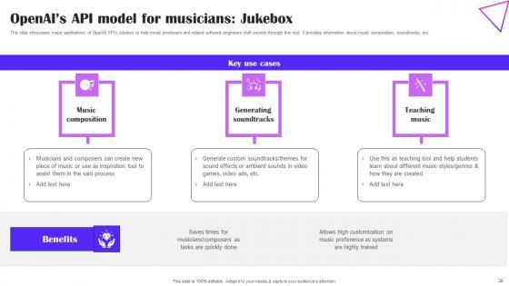 This slide showcases major applications of OpenAI APIs Jukebox to help music producers and related software engineers craft sounds through this tool. It provides information about music composition, soundtracks, etc. The Openais API Model For Musicians Jukebox Creative Applications For Open AI Download Pdf is a compilation of the most recent design trends as a series of slides. It is suitable for any subject or industry presentation, containing attractive visuals and photo spots for businesses to clearly express their messages. This template contains a variety of slides for the user to input data, such as structures to contrast two elements, bullet points, and slides for written information. Slidegeeks is prepared to create an impression. This slide showcases major applications of OpenAI APIs Jukebox to help music producers and related software engineers craft sounds through this tool. It provides information about music composition, soundtracks, etc.