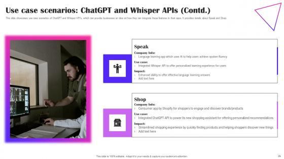 This slide showcases use case scenarios of ChatGPT and Whisper APIs, which can provide businesses an idea on how they can integrate these features in their apps. It provides details about Snap Inc., Quizlet and Instacart. Create an editable Use Case Scenarios ChatGPT And Whisper APIs Creative Applications For Open AI Portrait Pdf that communicates your idea and engages your audience. Whether you are presenting a business or an educational presentation, pre-designed presentation templates help save time. Use Case Scenarios ChatGPT And Whisper APIs Creative Applications For Open AI Portrait Pdf is highly customizable and very easy to edit, covering many different styles from creative to business presentations. Slidegeeks has creative team members who have crafted amazing templates. So, go and get them without any delay. This slide showcases use case scenarios of ChatGPT and Whisper APIs, which can provide businesses an idea on how they can integrate these features in their apps. It provides details about Snap Inc., Quizlet and Instacart.