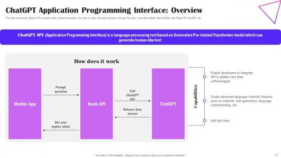 This slide showcases OpenAI API overview which related companies can refer to make informed decisions through this data. It provides details about Mobile App, Node API, ChatGPT, etc. From laying roadmaps to briefing everything in detail, our templates are perfect for you. You can set the stage with your presentation slides. All you have to do is download these easy-to-edit and customizable templates. ChatGPT Application Programming Interface Creative Applications For Open AI Introduction Pdf will help you deliver an outstanding performance that everyone would remember and praise you for. Do download this presentation today. This slide showcases OpenAI API overview which related companies can refer to make informed decisions through this data. It provides details about Mobile App, Node API, ChatGPT, etc.