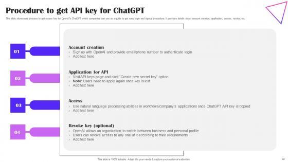 This slide showcases process to get access key for OpenAIs ChatGPT which companies can use as a guide to get easy login and signup procedure. It provides details about account creation, application, access, revoke, etc. Here you can discover an assortment of the finest PowerPoint and Google Slides templates. With these templates, you can create presentations for a variety of purposes while simultaneously providing your audience with an eye-catching visual experience. Download Procedure To Get API Key For ChatGPT Creative Applications For Open AI Diagrams Pdf to deliver an impeccable presentation. These templates will make your job of preparing presentations much quicker, yet still, maintain a high level of quality. Slidegeeks has experienced researchers who prepare these templates and write high-quality content for you. Later on, you can personalize the content by editing the Procedure To Get API Key For ChatGPT Creative Applications For Open AI Diagrams Pdf. This slide showcases process to get access key for OpenAIs ChatGPT which companies can use as a guide to get easy login and signup procedure. It provides details about account creation, application, access, revoke, etc.