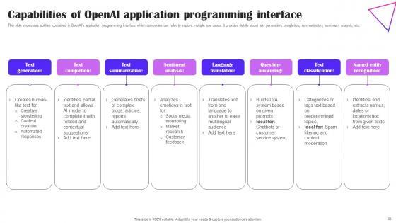 This slide showcases abilities contained in OpenAIs application programming interface which companies can refer to explore multiple use cases. It provides details about text generation, completion, summarization, sentiment analysis, etc. Slidegeeks is one of the best resources for PowerPoint templates. You can download easily and regulate Capabilities Of OpenAI Application Programming Creative Applications For Open AI Clipart Pdf for your personal presentations from our wonderful collection. A few clicks is all it takes to discover and get the most relevant and appropriate templates. Use our Templates to add a unique zing and appeal to your presentation and meetings. All the slides are easy to edit and you can use them even for advertisement purposes. This slide showcases abilities contained in OpenAIs application programming interface which companies can refer to explore multiple use cases. It provides details about text generation, completion, summarization, sentiment analysis, etc.