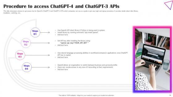 This slide showcases process to get access key for OpenAIs ChatGPT-3 and ChatGPT-4 APIs which companies can use as a guide to get easy login and signup procedure. It provides details about client library, installation, switching, etc. Presenting this PowerPoint presentation, titled Procedure To Access ChatGPT 4 And ChatGPT Creative Applications For Open AI Professional Pdf, with topics curated by our researchers after extensive research. This editable presentation is available for immediate download and provides attractive features when used. Download now and captivate your audience. Presenting this Procedure To Access ChatGPT 4 And ChatGPT Creative Applications For Open AI Professional Pdf. Our researchers have carefully researched and created these slides with all aspects taken into consideration. This is a completely customizable Procedure To Access ChatGPT 4 And ChatGPT Creative Applications For Open AI Professional Pdf that is available for immediate downloading. Download now and make an impact on your audience. Highlight the attractive features available with our PPTs. This slide showcases process to get access key for OpenAIs ChatGPT-3 and ChatGPT-4 APIs which companies can use as a guide to get easy login and signup procedure. It provides details about client library, installation, switching, etc.