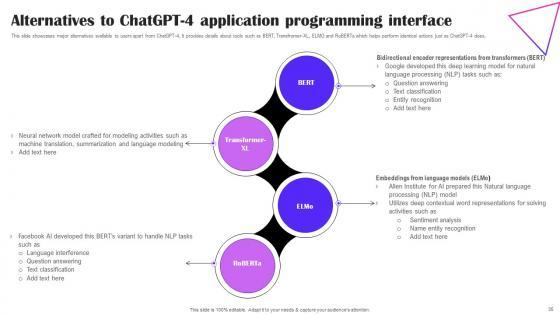 This slide showcases major alternatives available to users apart from ChatGPT-4. It provides details about tools such as BERT, Transfromer-XL, ELMO and RoBERTa which helps perform identical actions just as ChatGPT-4 does. Boost your pitch with our creative Alternatives To ChatGPT 4 Application Creative Applications For Open AI Inspiration Pdf. Deliver an awe-inspiring pitch that will mesmerize everyone. Using these presentation templates you will surely catch everyones attention. You can browse the ppts collection on our website. We have researchers who are experts at creating the right content for the templates. So you do not have to invest time in any additional work. Just grab the template now and use them. This slide showcases major alternatives available to users apart from ChatGPT-4. It provides details about tools such as BERT, Transfromer-XL, ELMO and RoBERTa which helps perform identical actions just as ChatGPT-4 does.