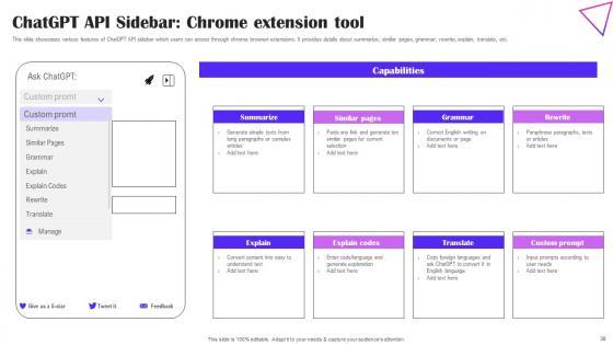 This slide showcases various features of ChatGPT API sidebar which users can access through chrome browser extensions. It provides details about summarize, similar pages, grammar, rewrite, explain, translate, etc. Get a simple yet stunning designed ChatGPT API Sidebar Chrome Extension Tool Creative Applications For Open AI Ideas Pdf. It is the best one to establish the tone in your meetings. It is an excellent way to make your presentations highly effective. So, download this PPT today from Slidegeeks and see the positive impacts. Our easy-to-edit ChatGPT API Sidebar Chrome Extension Tool Creative Applications For Open AI Ideas Pdf can be your go-to option for all upcoming conferences and meetings. So, what are you waiting for Grab this template today. This slide showcases various features of ChatGPT API sidebar which users can access through chrome browser extensions. It provides details about summarize, similar pages, grammar, rewrite, explain, translate, etc.
