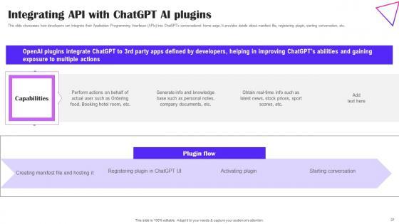 This slide showcases how developers can integrate their Application Programming Interfaces APIs into ChatGPTs conversational home page. It provides details about manifest file, registering plugin, starting conversation, etc. If your project calls for a presentation, then Slidegeeks is your go-to partner because we have professionally designed, easy-to-edit templates that are perfect for any presentation. After downloading, you can easily edit Integrating API With ChatGPT AI Plugins Creative Applications For Open AI Template Pdf and make the changes accordingly. You can rearrange slides or fill them with different images. Check out all the handy templates This slide showcases how developers can integrate their Application Programming Interfaces APIs into ChatGPTs conversational home page. It provides details about manifest file, registering plugin, starting conversation, etc.