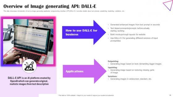 This slide showcases introduction of text-to-image generating application programming interface API DALL-E. it provides details about text prompt, outpainting, inpainting, variations, etc. Retrieve professionally designed Overview Of Image Generating API Dall E Creative Applications For Open AI Elements Pdf to effectively convey your message and captivate your listeners. Save time by selecting pre-made slideshows that are appropriate for various topics, from business to educational purposes. These themes come in many different styles, from creative to corporate, and all of them are easily adjustable and can be edited quickly. Access them as PowerPoint templates or as Google Slides themes. You do not have to go on a hunt for the perfect presentation because Slidegeeks got you covered from everywhere. This slide showcases introduction of text-to-image generating application programming interface API DALL-E. it provides details about text prompt, outpainting, inpainting, variations, etc.
