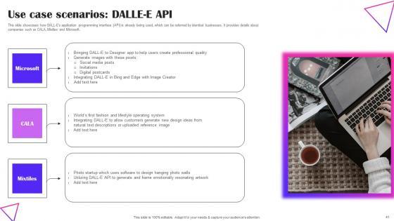This slide showcases how DALL-Es application programming interface API is already being used, which can be referred by identical businesses. It provides details about companies such as CALA, Mixtiles and Microsoft. Slidegeeks is one of the best resources for PowerPoint templates. You can download easily and regulate Use Case Scenarios Dalle E API Creative Applications For Open AI Structure Pdf for your personal presentations from our wonderful collection. A few clicks is all it takes to discover and get the most relevant and appropriate templates. Use our Templates to add a unique zing and appeal to your presentation and meetings. All the slides are easy to edit and you can use them even for advertisement purposes. This slide showcases how DALL-Es application programming interface API is already being used, which can be referred by identical businesses. It provides details about companies such as CALA, Mixtiles and Microsoft.