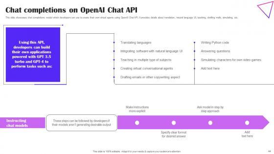 This slide showcases chat completions model which developers can use to create their own virtual agents using OpenAI Chat API. It provides details about translation, natural language UI, teaching, drafting mails, simulating, etc. There are so many reasons you need a Chat Completions On OpenAI Chat API Creative Applications For Open AI Topics Pdf. The first reason is you can not spend time making everything from scratch, Thus, Slidegeeks has made presentation templates for you too. You can easily download these templates from our website easily. This slide showcases chat completions model which developers can use to create their own virtual agents using OpenAI Chat API. It provides details about translation, natural language UI, teaching, drafting mails, simulating, etc.