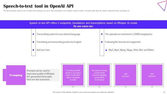 This slide showcases speech to text AI model which developers can use to make transcriptions and translations based on audios. It provides details about file uploads, supported formats, prompting, etc. Do you know about Slidesgeeks Speech To Text Tool In OpenAI API Creative Applications For Open AI Themes Pdf These are perfect for delivering any kind od presentation. Using it, create PowerPoint presentations that communicate your ideas and engage audiences. Save time and effort by using our pre-designed presentation templates that are perfect for a wide range of topic. Our vast selection of designs covers a range of styles, from creative to business, and are all highly customizable and easy to edit. Download as a PowerPoint template or use them as Google Slides themes. This slide showcases speech to text AI model which developers can use to make transcriptions and translations based on audios. It provides details about file uploads, supported formats, prompting, etc.