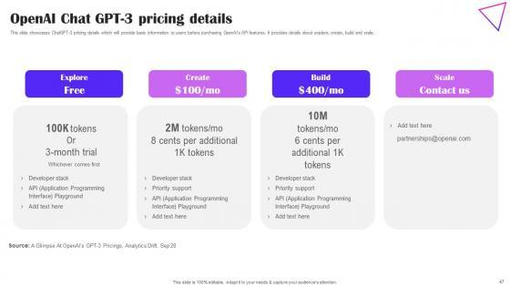 This slide showcases ChatGPT-3 pricing details which will provide basic information to users before purchasing OpenAIs API features. It provides details about explore, create, build and scale. Explore a selection of the finest Openai Chat Gpt 3 Pricing Details Creative Applications For Open AI Mockup Pdf here. With a plethora of professionally designed and pre-made slide templates, you can quickly and easily find the right one for your upcoming presentation. You can use our Openai Chat Gpt 3 Pricing Details Creative Applications For Open AI Mockup Pdf to effectively convey your message to a wider audience. Slidegeeks has done a lot of research before preparing these presentation templates. The content can be personalized and the slides are highly editable. Grab templates today from Slidegeeks. This slide showcases ChatGPT-3 pricing details which will provide basic information to users before purchasing OpenAIs API features. It provides details about explore, create, build and scale.