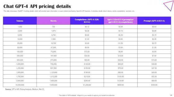 This slide showcases ChatGPT-4 pricing details which will provide basic information to users before purchasing OpenAIs API features. It provides details about tokens, words, completions, prompts, etc. Do you have to make sure that everyone on your team knows about any specific topic I yes, then you should give Chat Gpt 4 API Pricing Details Creative Applications For Open AI Slides Pdf a try. Our experts have put a lot of knowledge and effort into creating this impeccable Chat Gpt 4 API Pricing Details Creative Applications For Open AI Slides Pdf. You can use this template for your upcoming presentations, as the slides are perfect to represent even the tiniest detail. You can download these templates from the Slidegeeks website and these are easy to edit. So grab these today. This slide showcases ChatGPT-4 pricing details which will provide basic information to users before purchasing OpenAIs API features. It provides details about tokens, words, completions, prompts, etc.