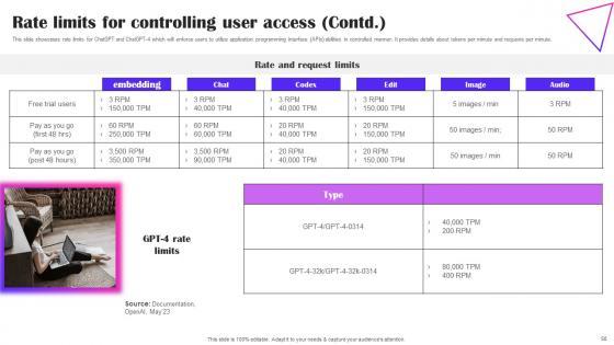 This slide showcases rate limits for ChatGPT and ChatGPT-4 which will enforce users to utilize application programming interface APIs abilities in controlled manner. It provides details about tokens per minute and requests per minute. Take your projects to the next level with our ultimate collection of Rate Limits For Controlling User Access Creative Applications For Open AI Elements Pdf. Slidegeeks has designed a range of layouts that are perfect for representing task or activity duration, keeping track of all your deadlines at a glance. Tailor these designs to your exact needs and give them a truly corporate look with your own brand colors they well make your projects stand out from the rest. This slide showcases rate limits for ChatGPT and ChatGPT-4 which will enforce users to utilize application programming interface APIs abilities in controlled manner. It provides details about tokens per minute and requests per minute.