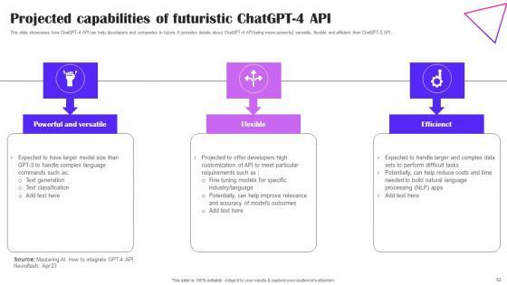 This slide showcases how ChatGPT-4 API can help developers and companies in future. It provides details about ChatGPT-4 API being more powerful, versatile, flexible and efficient than ChatGPT-3 API. This Projected Capabilities Of Futuristic ChatGPT Creative Applications For Open AI Demonstration Pdf from Slidegeeks makes it easy to present information on your topic with precision. It provides customization options, so you can make changes to the colors, design, graphics, or any other component to create a unique layout. It is also available for immediate download, so you can begin using it right away. Slidegeeks has done good research to ensure that you have everything you need to make your presentation stand out. Make a name out there for a brilliant performance. This slide showcases how ChatGPT-4 API can help developers and companies in future. It provides details about ChatGPT-4 API being more powerful, versatile, flexible and efficient than ChatGPT-3 API.