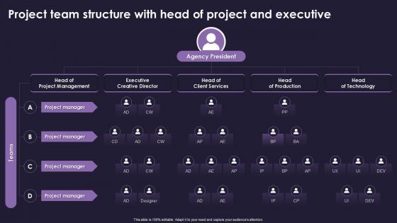 This Project Team Structure With Head Of Project And Executive Creative Directors is perfect for any presentation, be it in front of clients or colleagues. It is a versatile and stylish solution for organizing your meetings. The Project Team Structure With Head Of Project And Executive Creative Directors features a modern design for your presentation meetings. The adjustable and customizable slides provide unlimited possibilities for acing up your presentation. Slidegeeks has done all the homework before launching the product for you. So, do not wait, grab the presentation templates today Add to the informality with our Project Team Structure, which includes the Head of Project and Executive Creative Directors. Encourage talks in a welcoming environment.
