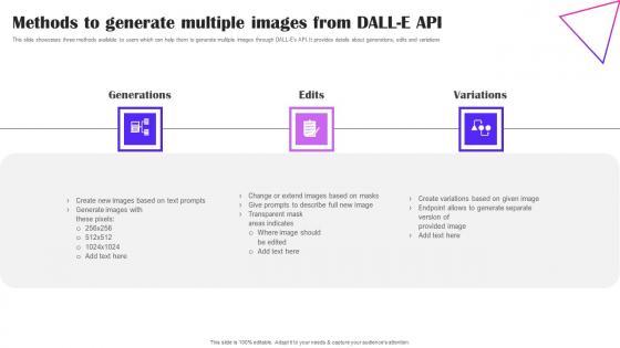 This slide showcases three methods available to users which can help them to generate multiple images through DALL-Es API. It provides details about generations, edits and variations. Formulating a presentation can take up a lot of effort and time, so the content and message should always be the primary focus. The visuals of the PowerPoint can enhance the presenters message, so our Methods To Generate Multiple Images From Dall Creative Applications For Open AI Themes Pdf was created to help save time. Instead of worrying about the design, the presenter can concentrate on the message while our designers work on creating the ideal templates for whatever situation is needed. Slidegeeks has experts for everything from amazing designs to valuable content, we have put everything into Methods To Generate Multiple Images From Dall Creative Applications For Open AI Themes Pdf This slide showcases three methods available to users which can help them to generate multiple images through DALL-Es API. It provides details about generations, edits and variations.